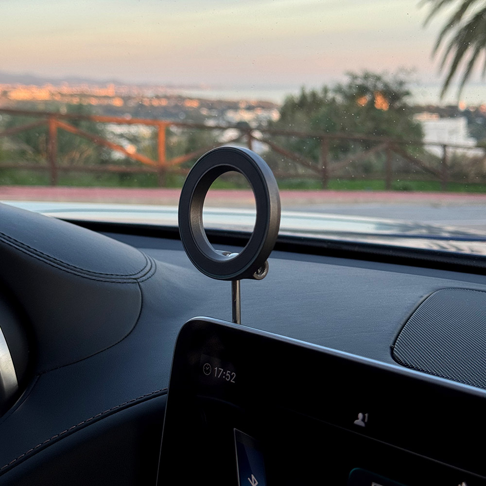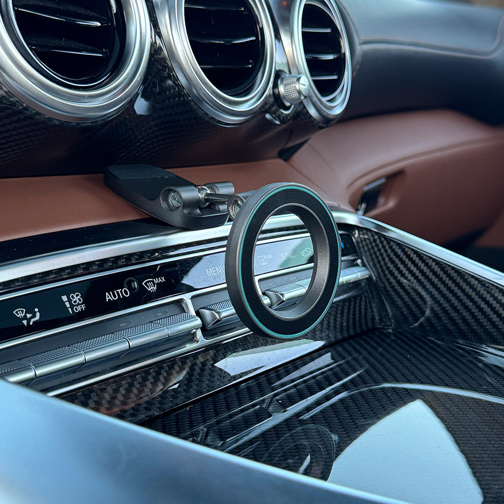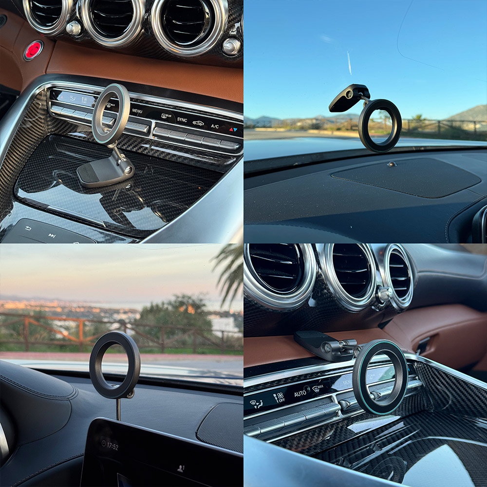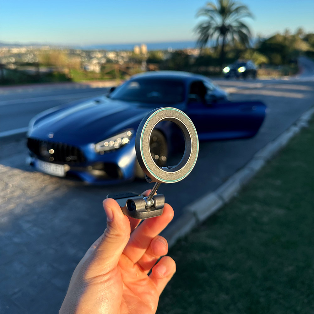 The F4 MagSafe Adjustable Mount is a full-metal, fully adjustable mount for iPhone users. It locks securely, adjusts easily, and features a phosphorescent ring that glows in the dark.